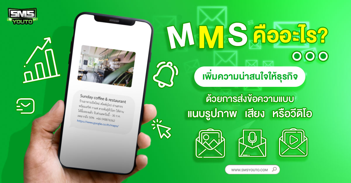 MMS คืออะไร ? เพิ่มความน่าสนใจให้ธุรกิจ ด้วยการส่งข้อความแบบแนบรูปภาพ เสียง หรือวีดิโอ SMSYOUTO หนึ่งในผู้ให้บริการด้านการส่งข้อความทุกรูปแบบ...