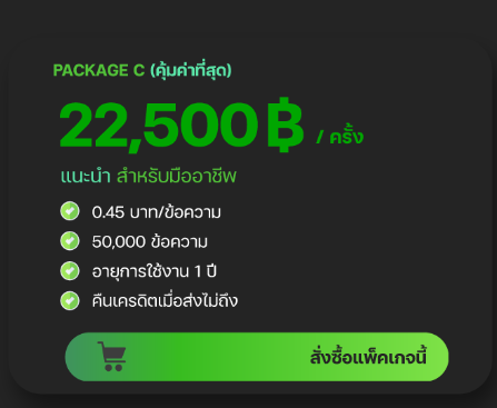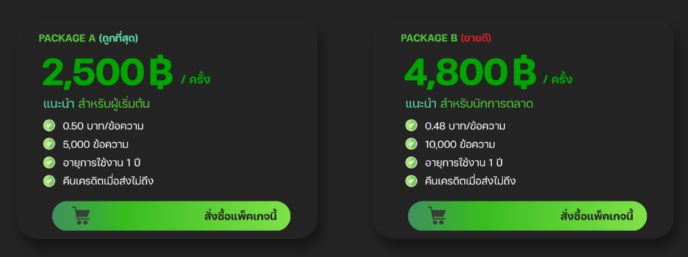 อีกทั้งยังตอบโจทย์ธุรกิจที่กว้างขวาง ไม่ว่าจะเป็นธุรกิจค้าขาย ธุรกิจขนส่ง ธุรกิจประกัน E-Commerce ธุรกิจซ่อมบำรุง บริษัทรับสมัครงาน (Recruitment) หรือแม้แต่ธุรกิจคลินิกความงาม เราจะทำให้คุณสื่อสาร ทำการตลาดกับลูกค้าได้ตรงจุด และประชาสัมพันธ์ได้อย่างมีประสิทธิภาพ ไปดูพร้อมกันเลยว่าเรามีแพ็คเกจอะไรบ้าง เรามีแพ็คเกจหลากหลายราคา เริ่มตั้งแต่ราคาถูก ถือเป็นตัวเลือกที่ดีหากใครอยู่ในระดับผู้เริ่มต้นทำธุรกิจ นักการตลาด รวมถึงนักธุรกิจมืออาชีพที่อยากเริ่มใช้งาน SMS Marketing และมีแพ็คเกจราคาที่เป็นที่นิยม เพิ่มตัวเลือกที่คุ้มค่ามากขึ้นสำหรับธุรกิจขนาดกลาง